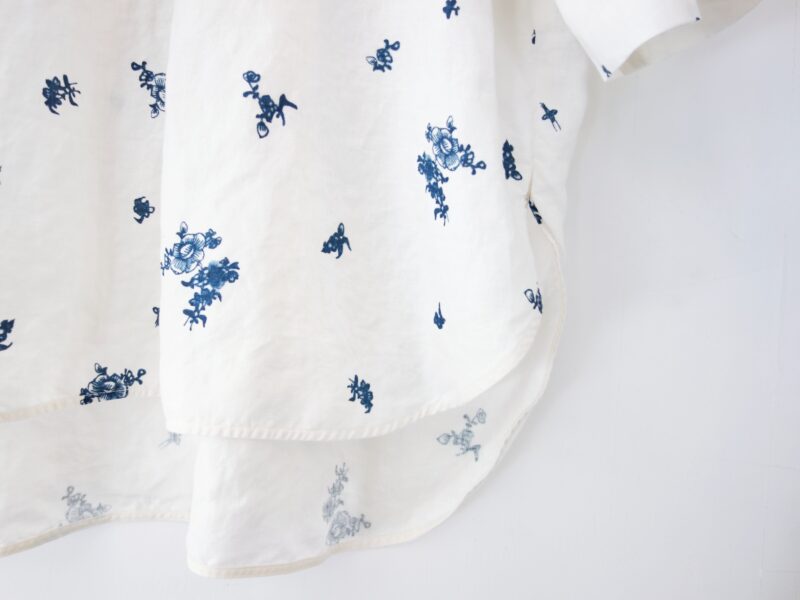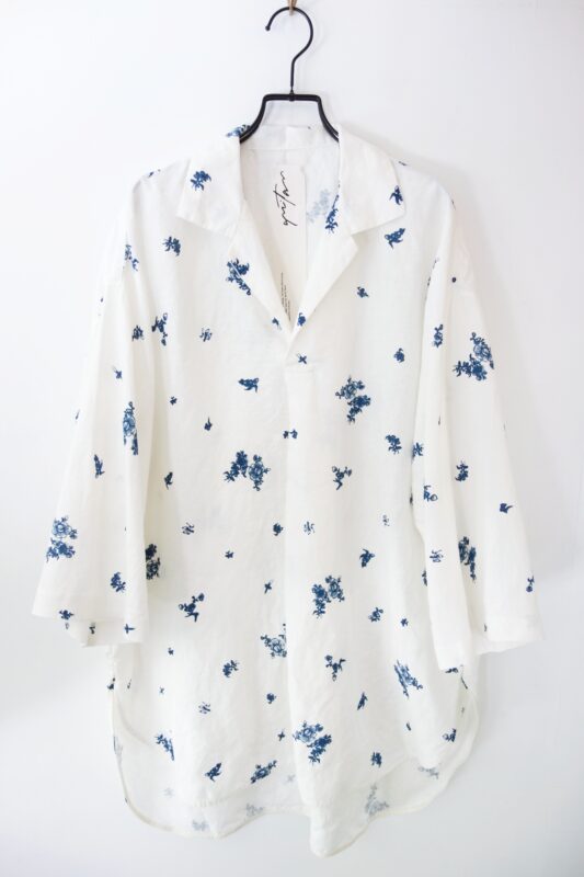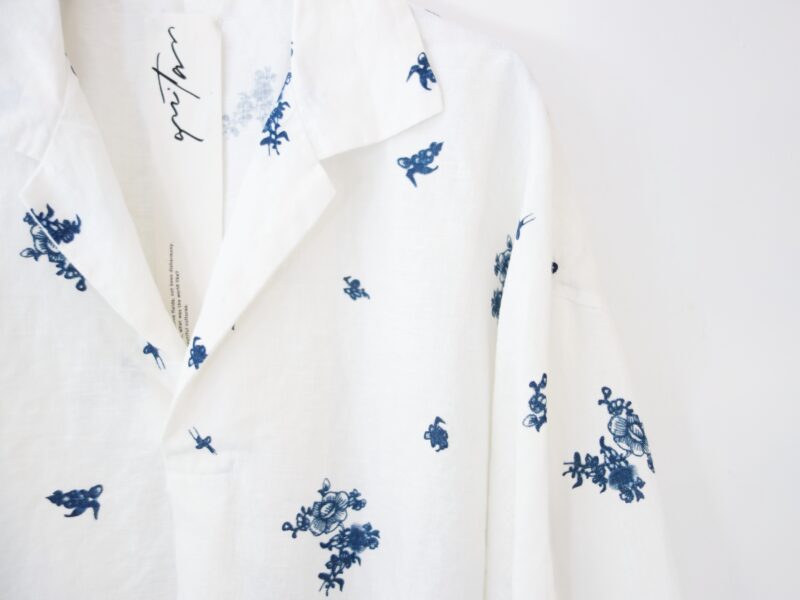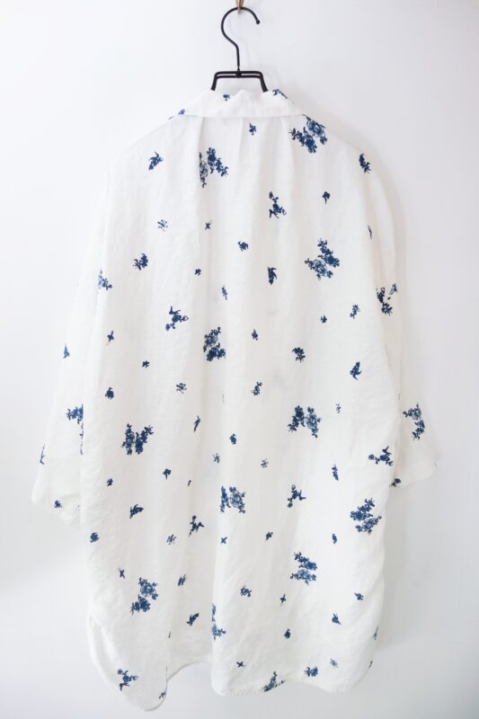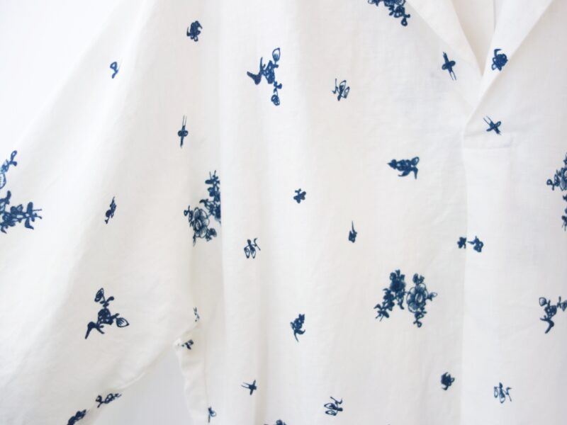 つい柄にばかり目が行ってしまいますが、やや肩に傾斜のかかったボックスシルエットは、身に纏ったときの姿が美しく、そして着心地も軽快。