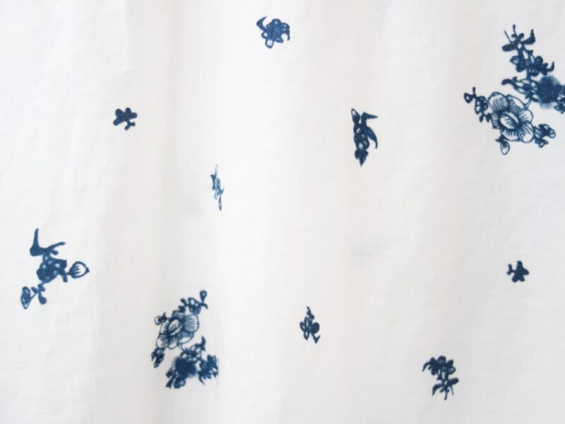 生地全体に抜染でプリントされているこの柄は、先日ご紹介したコートや栞など、written byのクリエーションのパートナーとしてもはやおなじみ、「紙のテキスタイル」を展開するユニットRivotorto Piecesとのコラボレーションによって生まれました。